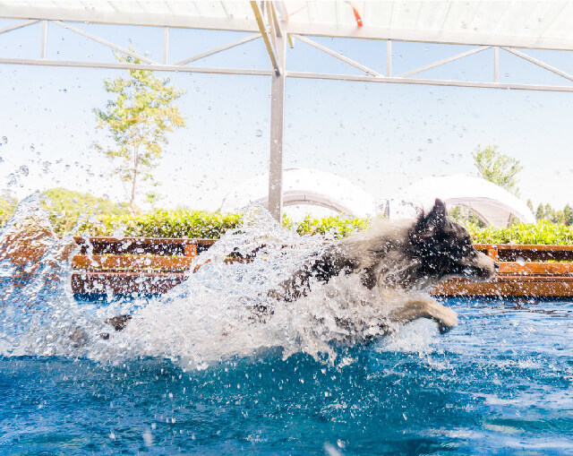 太阳岛宠物泳池,总面积75平方米,20、30、40、120cm深浅泳道,半户外木质结构,池顶加盖遮阳棚。按国家标准严控水质,每天吸取漂浮杂物,打捞杂物清理掉落宠物毛发,确保安全卫生。